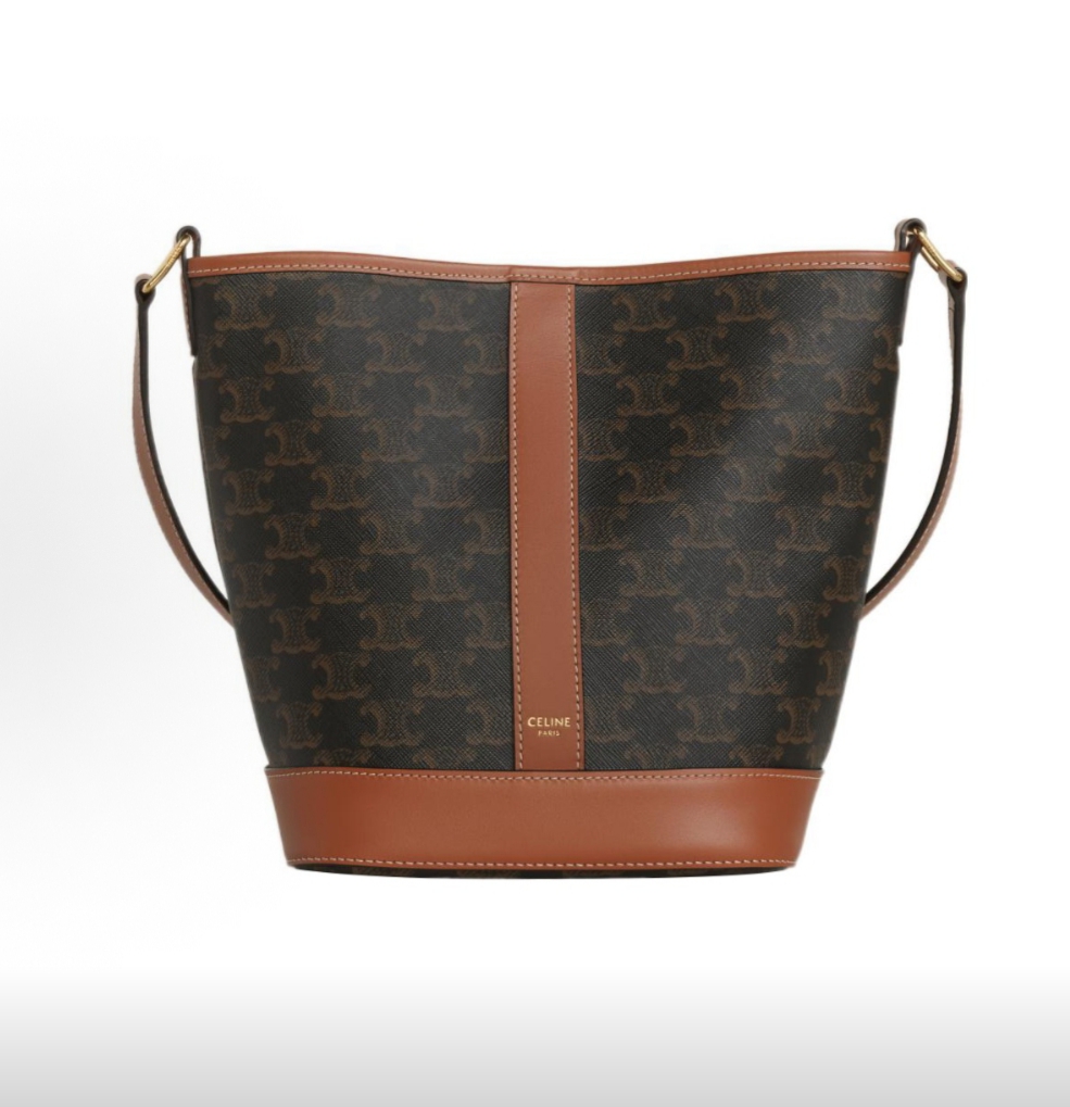 CELINE赛琳 Triomphe 经典满印老花 人造革拼牛皮革 水桶包单肩斜挎包 小号 女款 黄褐色